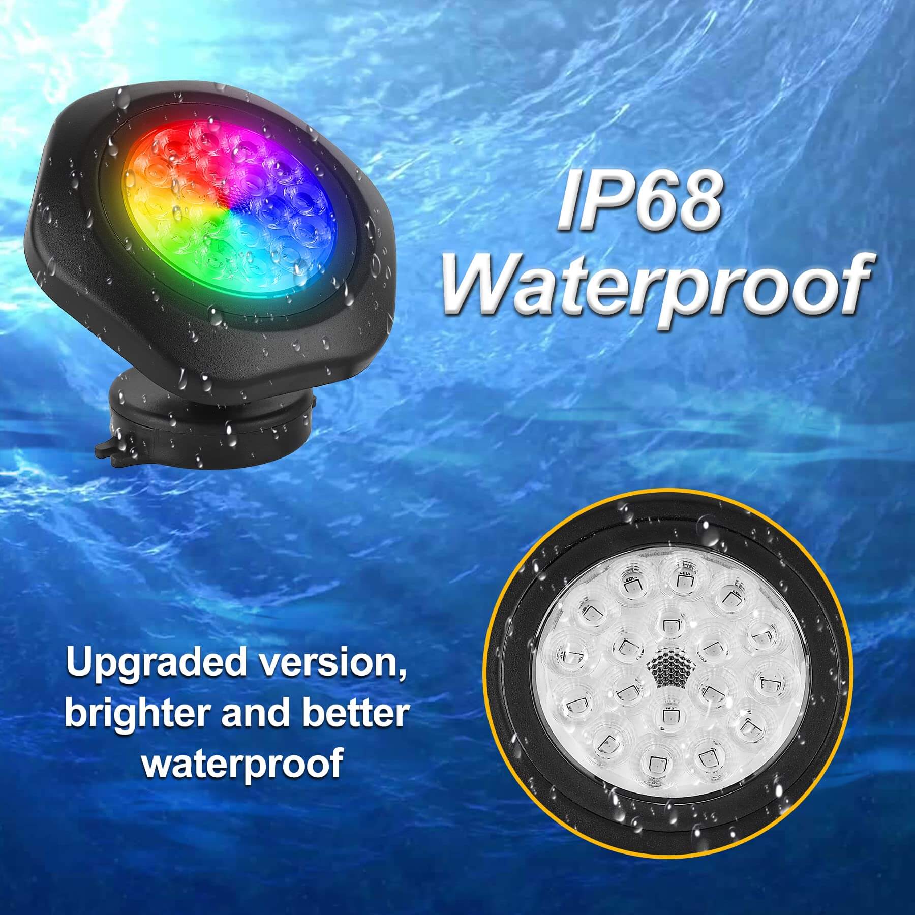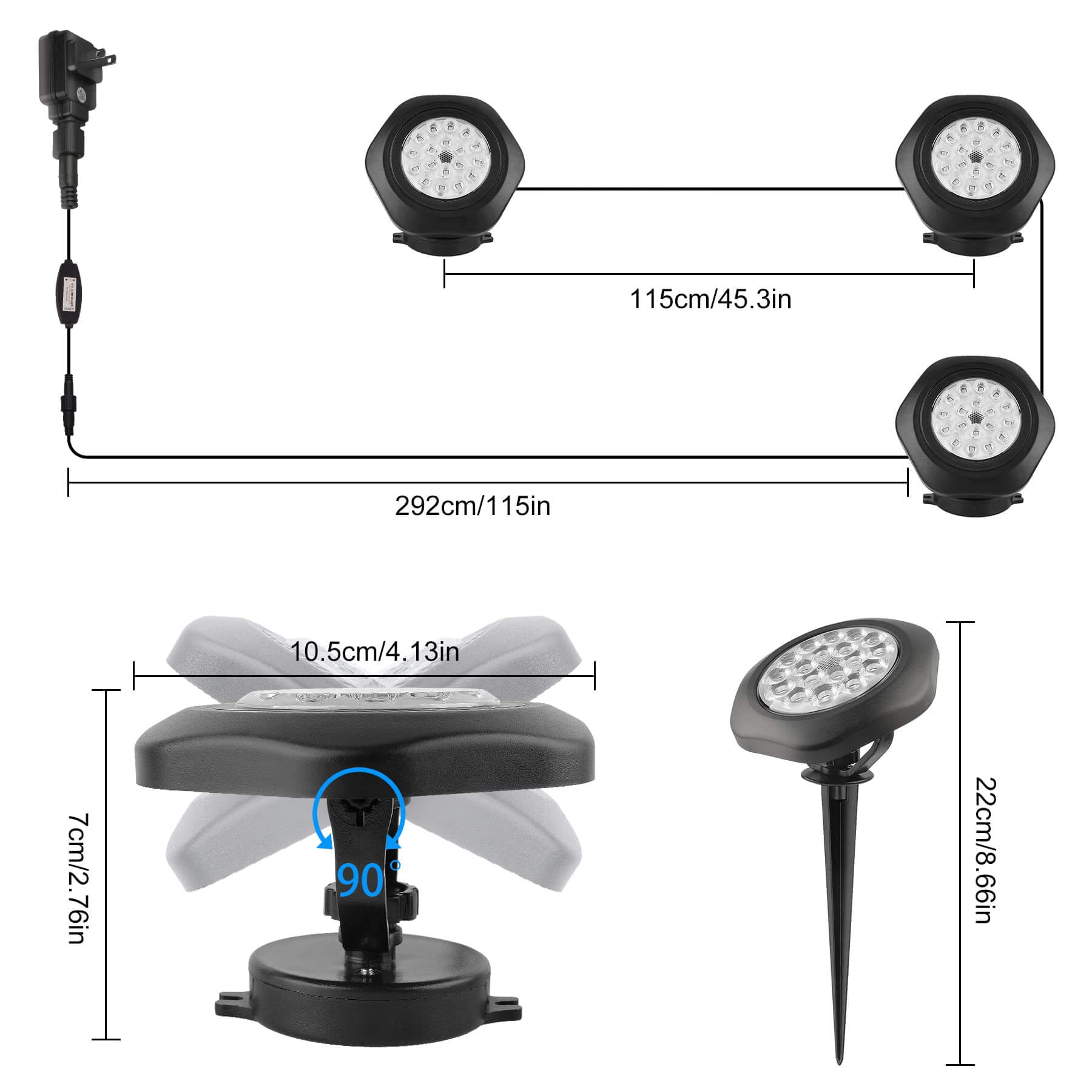 •  5-in-1 RGBW Pond Lights Adjustable, Brighter & Longer Wire. TSUN LED Underwater Submersible Lights light heads can be adjusted 90 degrees. One light have 18 LED beads, total 54 LED, Super bright-updated version is designed with a convex lens for brighter light. Comes with 216in/5.5m wire, more flexible and convenient to use.