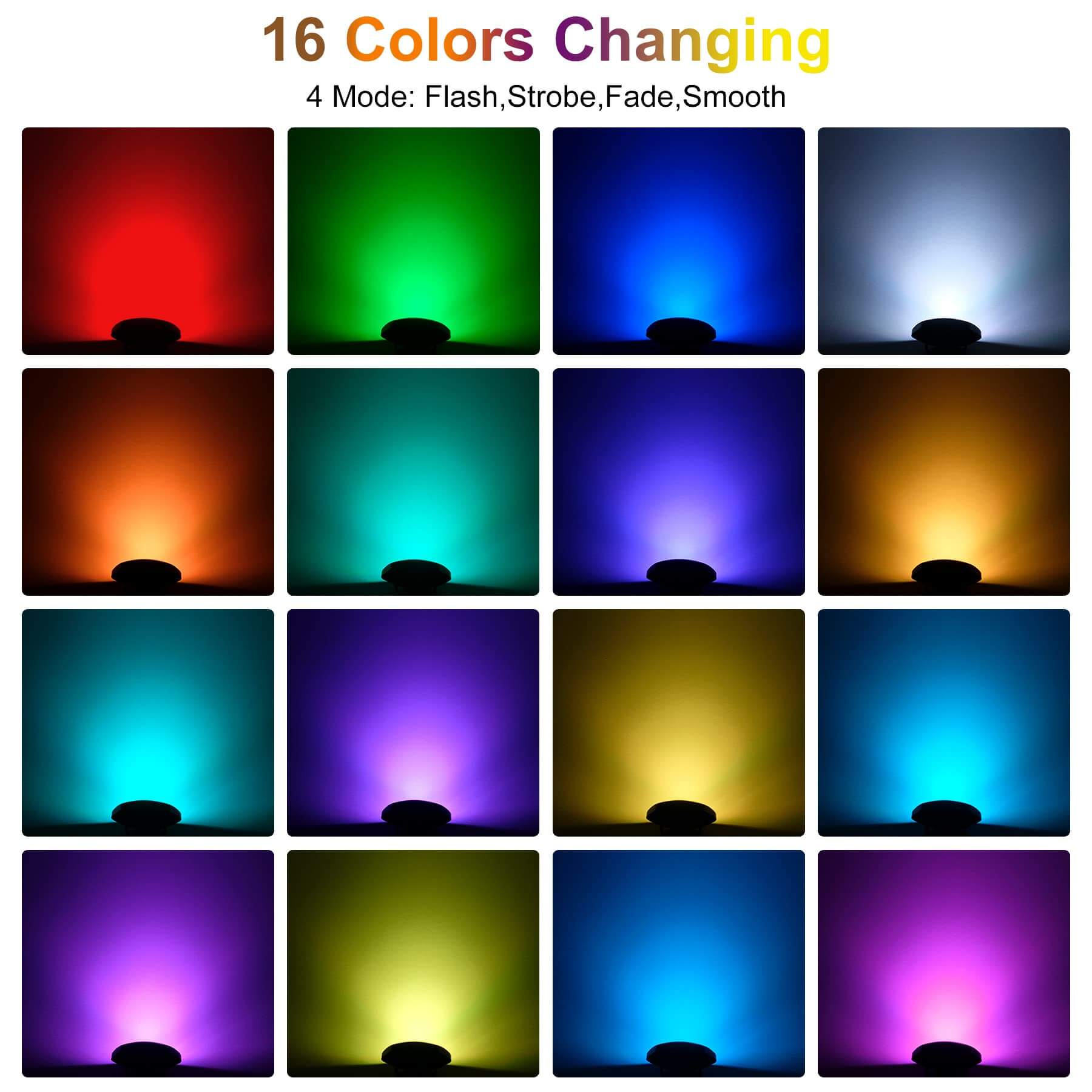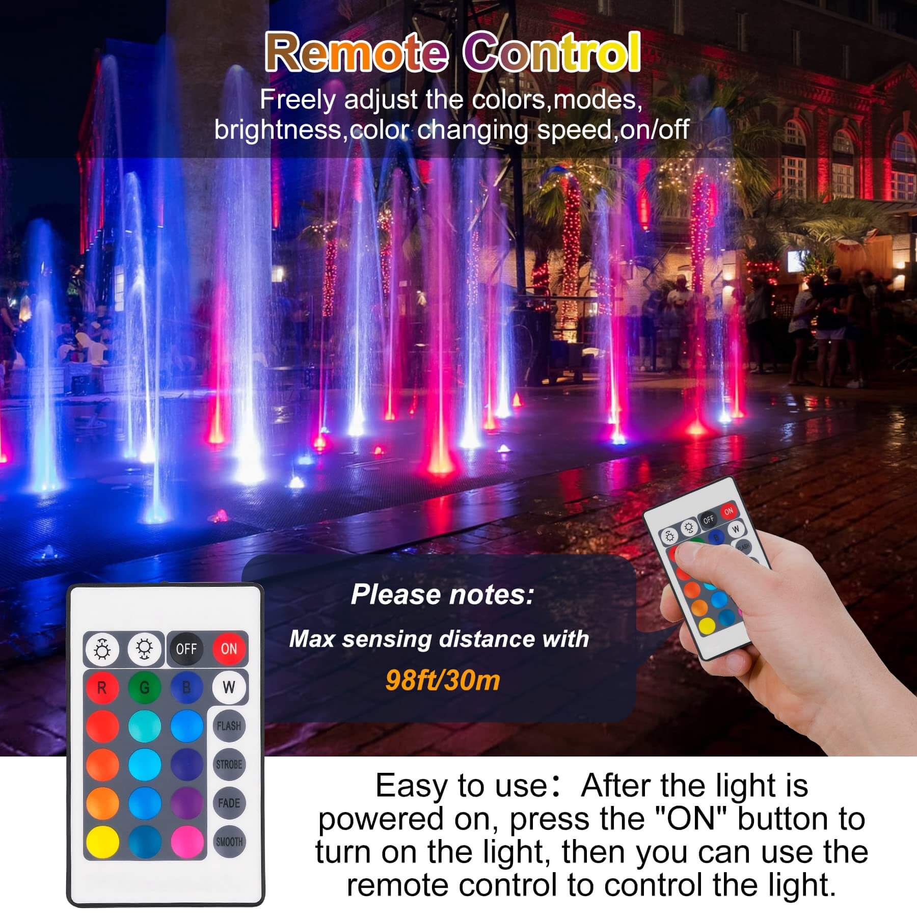 • TSUN Pond Lights provides 16 colors (Including white light), 4 modes of dynamic effects, and static fixed color effects, brightness adjustable, you can freely control the light via the wireless remote. If the remote control can't control the light, please press "STROBE" and "FADE" at the same time to activate the connection between the light and the remote control.