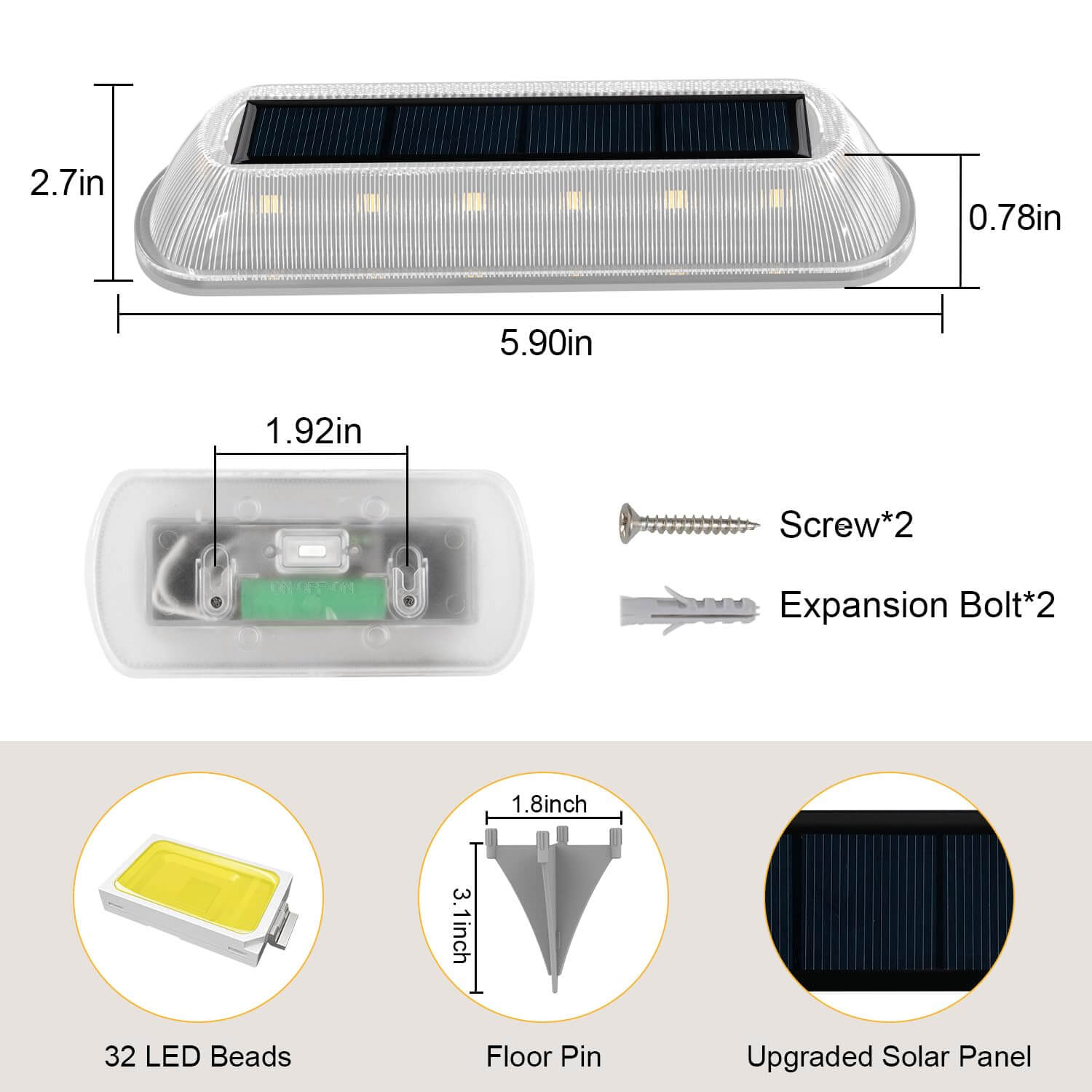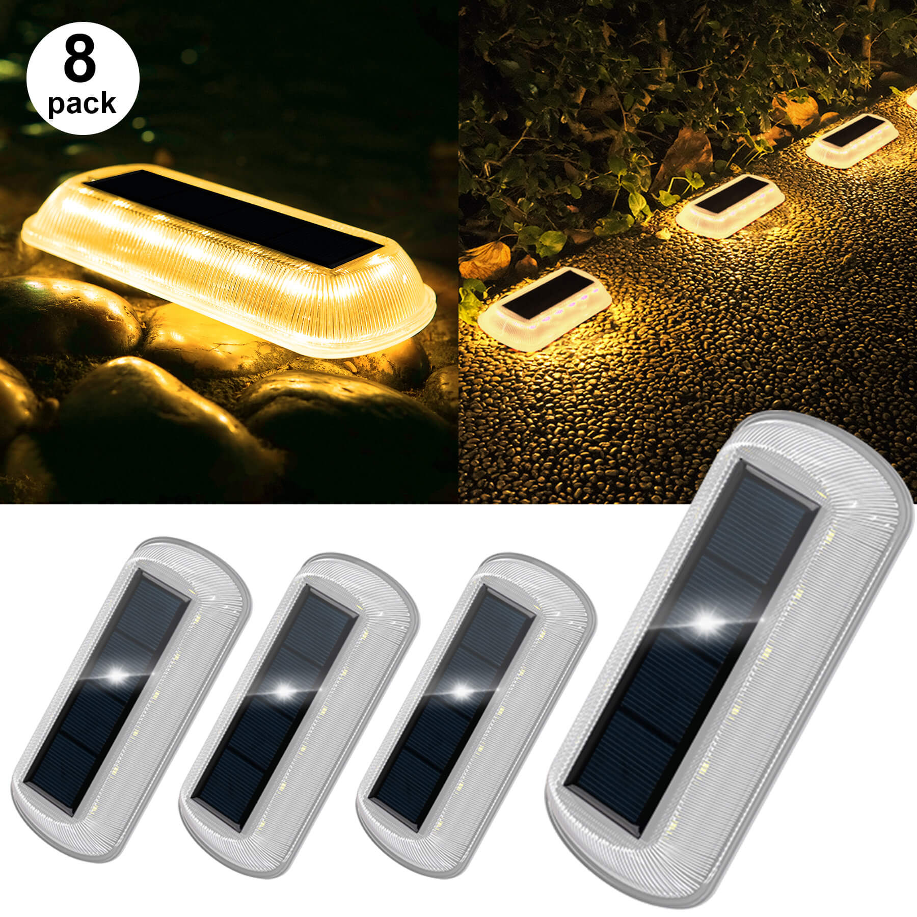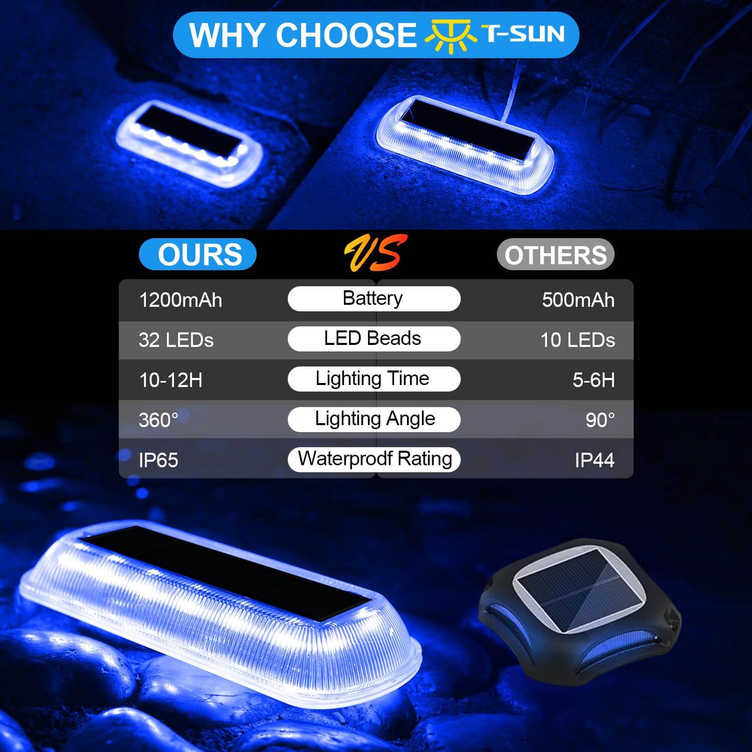 • ⛈️【IP68 Waterproof】T-SUN outdoor solar lights waterproof made with durable PC material, adopt fully enclosed integrated design so they are waterproof up to IP68. This dock lights for outside can withstand all kinds of weather conditions, including rain, snow and frost which commonly used as solar driveway light, solar deck lights and walkway lights.