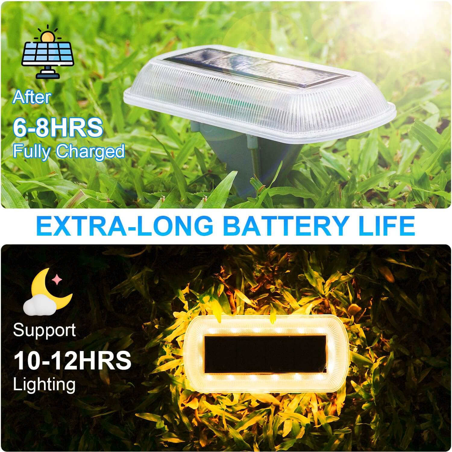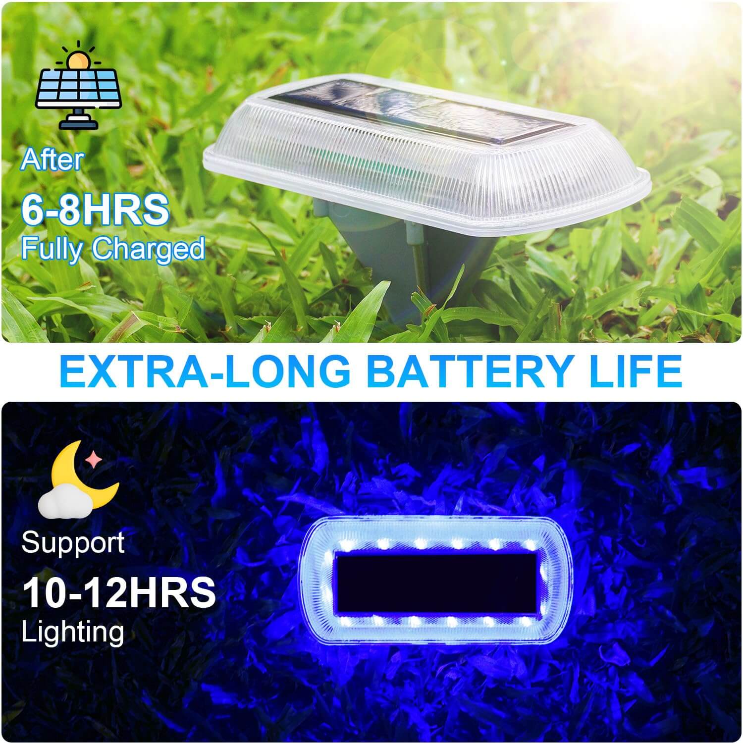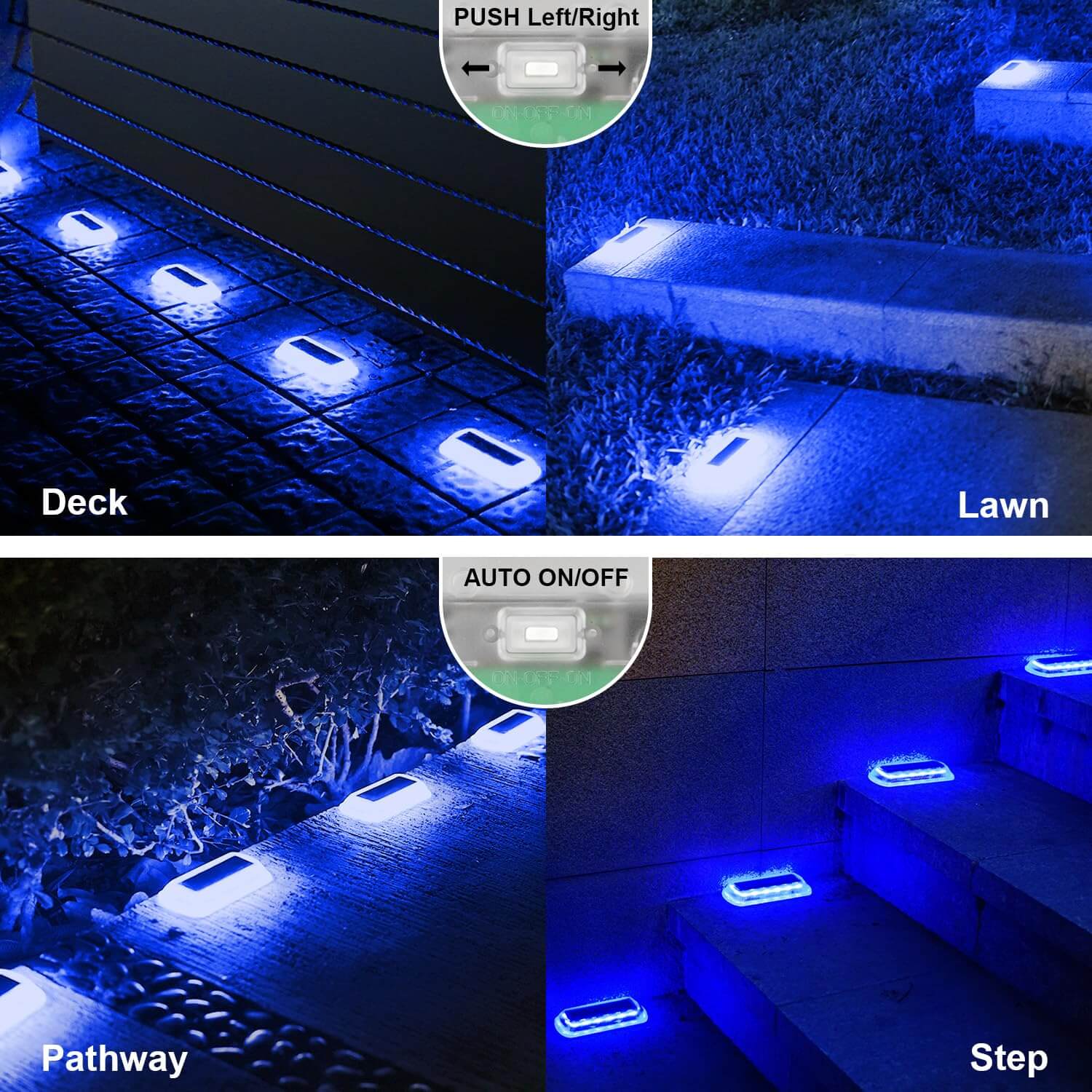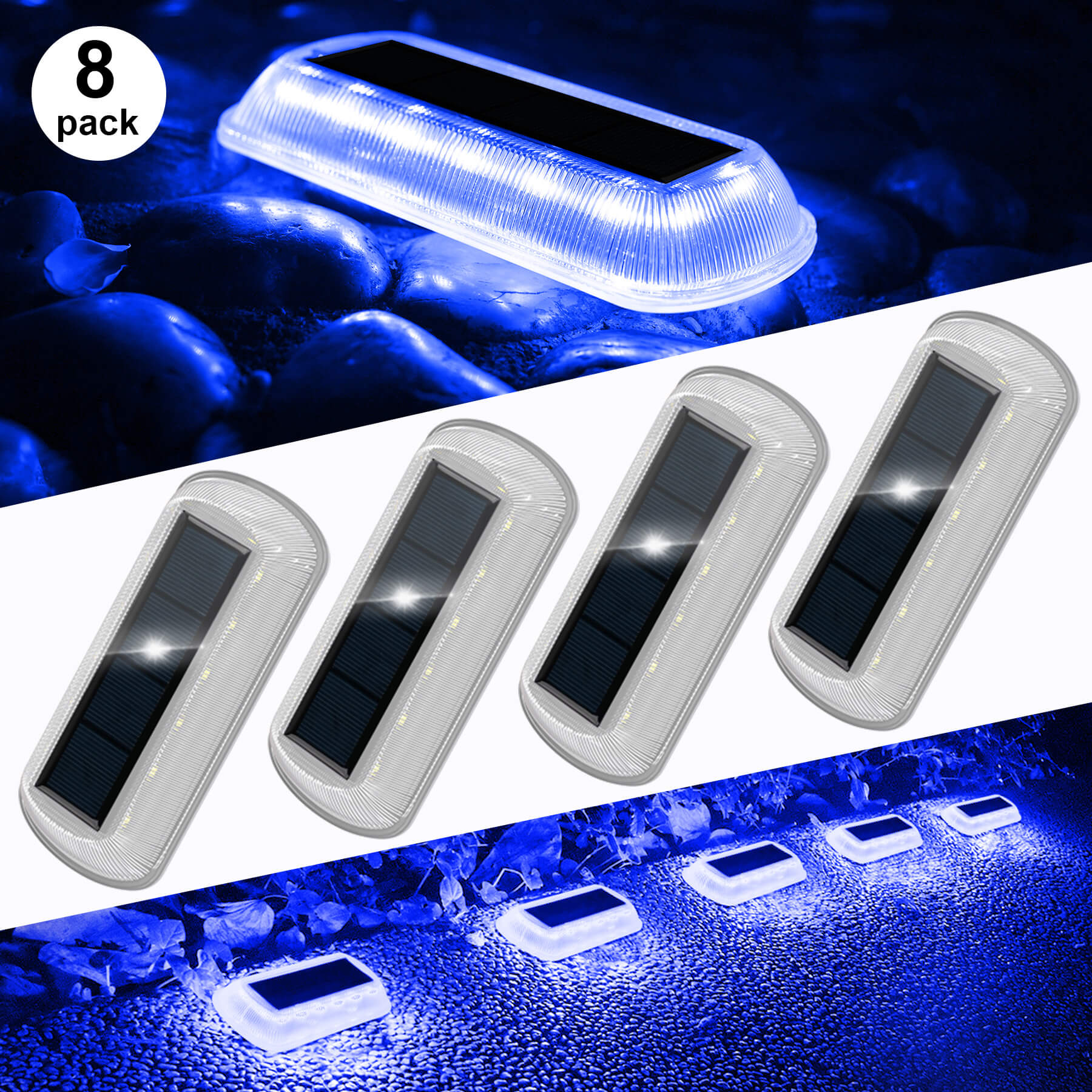 • 【Solar Deck Lights】Our deck lights are made of super-bright LED lights (light source), the whole light wide coverage and long life. Designed with blue/warm white lighting, this outdoor solar light has a high-grade appearance, exquisite and beautiful, providing pleasant light and mysterious colors for your garden, sidewalks, patio corridors, lawns, trails, garages and other outdoor places.