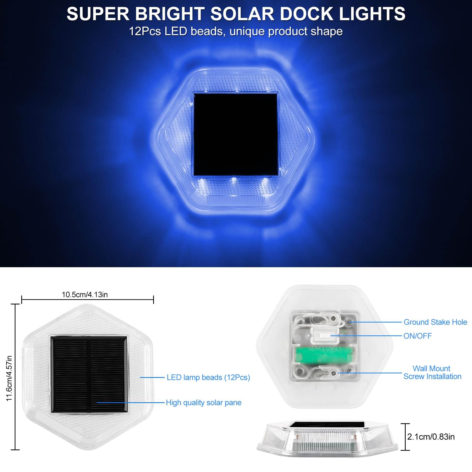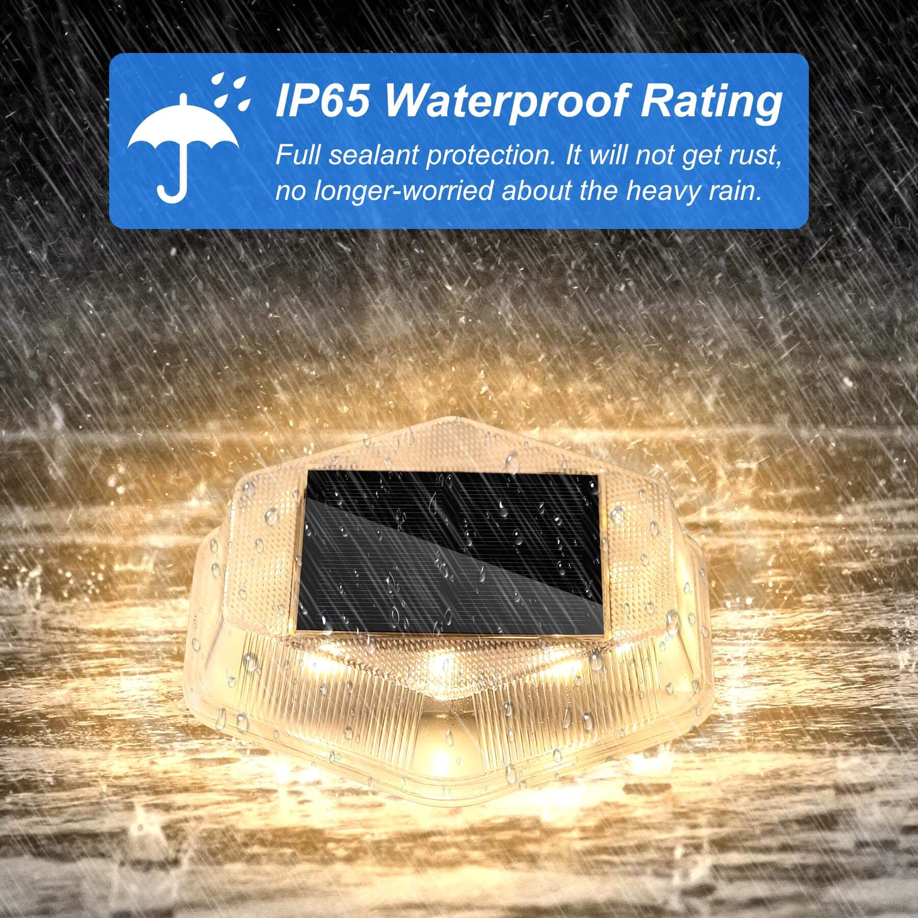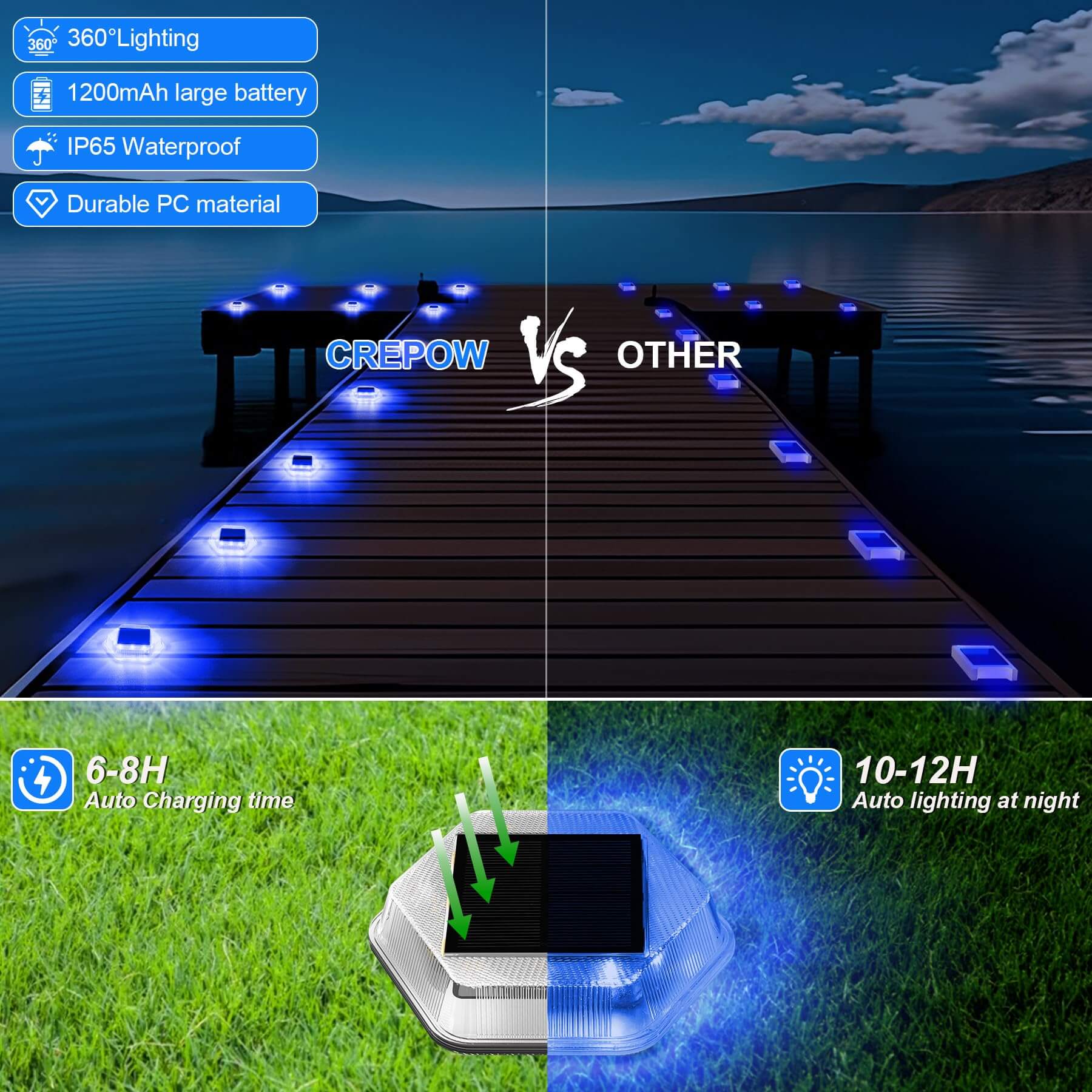 • 【IP65 Waterproof】Solar dock light adopts one-piece ultrasonic welding technology with sleek structure, with IP65 waterproof, which can withstand all kinds of bad weather in all seasons.
