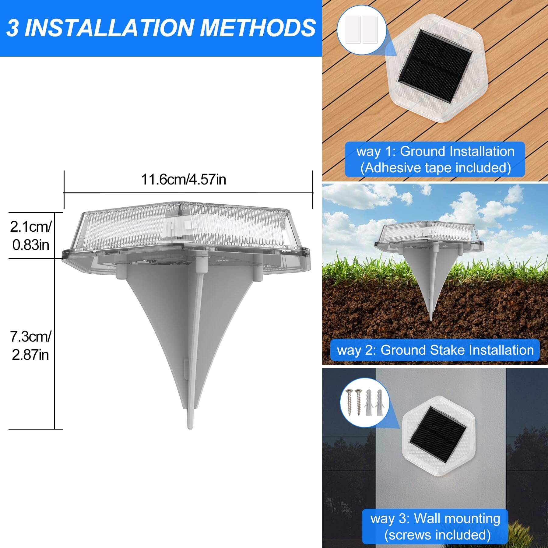 • 【3 types of installation】 Led Solar Dock Lights can be quickly installed in any ground where it can absorb the sun light directly. There are 3 mounting options: 1. Use screws to mount on walls, fence wood posts 2. Use ground stakes to mount on lawns, gardens 3. Use double sided tape to attach to concrete pathways, decks, stairs, driveways, patios. (Package does not include double sided tape, need to buy separately). Widely used for docks, decks, pools, steps, pilasters, porches, landscaping, pathways, patios, yards, gardens.