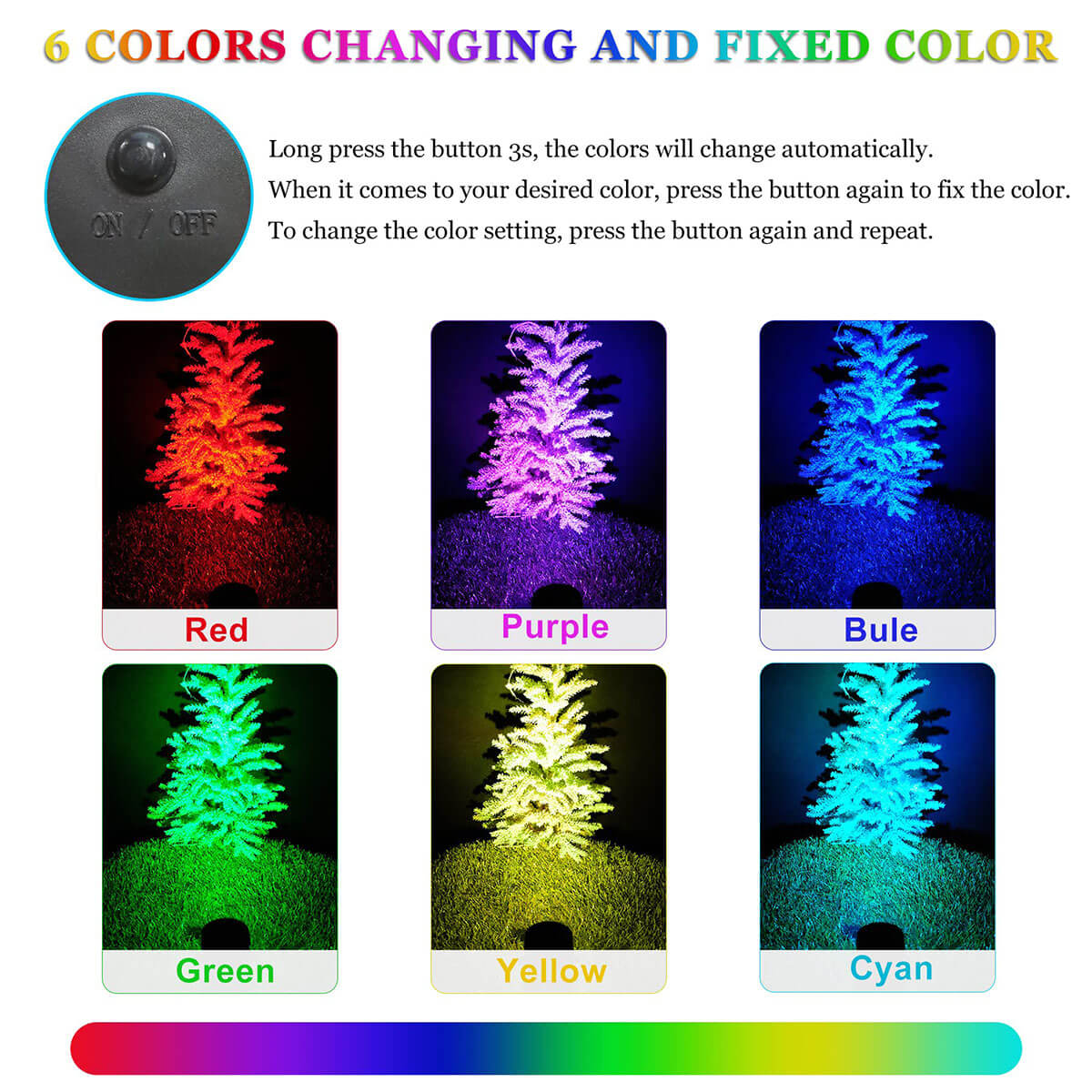 • Colorful mode & fixed color mode: 6 color variations and fixed colors. To choose the color you want, press the button once. The color will change constantly. When it comes to the color you want, press the button again. This will set the color you want. To change the color setting, press the button again and repeat.