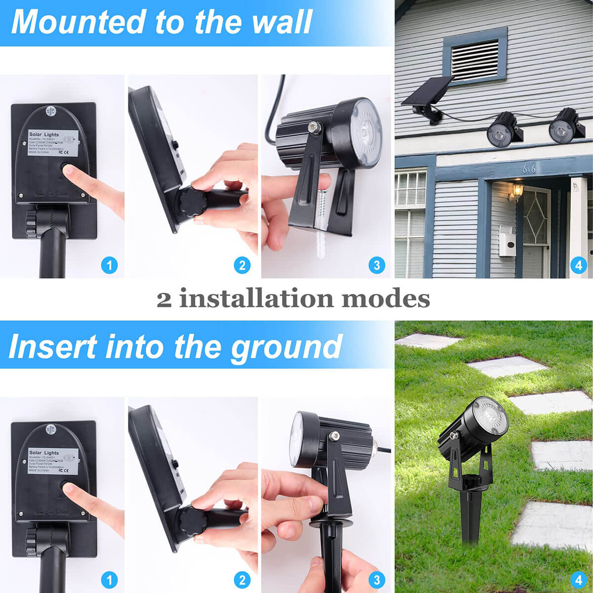 • Adjustable lights and solar panels: Solar panels and lights can be installed on the ground or on the wall with the attached screws. 270° up and down can be adjusted freely to meet different needs.
