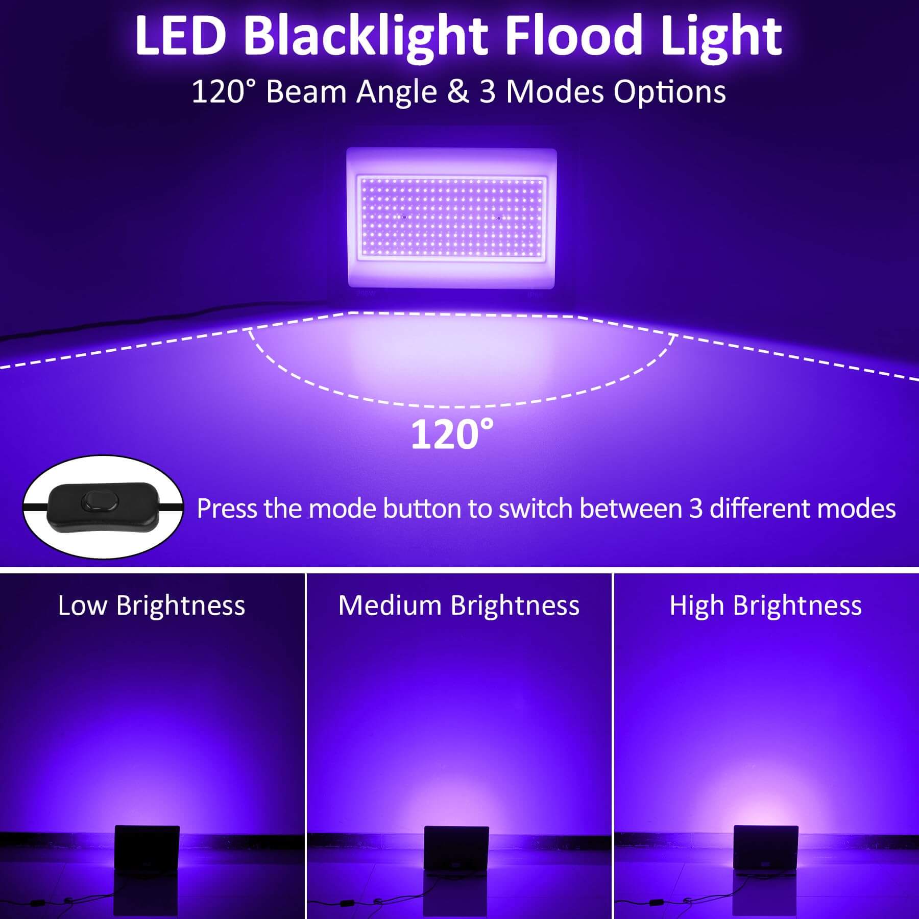• [3-Level Adjustable Brightness] This 200W black light flood light offers 3 brightness settings—High (100%), Medium(75% ), and Low (25%)—easily switched with a single press of the mode button. Quickly adapt to variety of lighting need with seamless transitions between modes